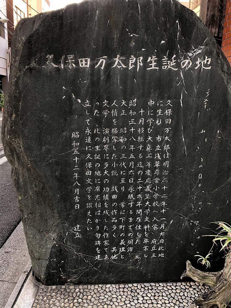 江戸料理櫻田の前に建つ碑は大正、昭和の文壇に多大なる貢献をした久保田万太郎の生家があった場所で久保田万太郎生誕の地として建てられました。